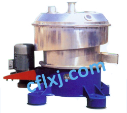 本離心機(jī)主要由轉(zhuǎn)鼓、傳動(dòng)座、機(jī)座、內(nèi)殼、外機(jī)殼和上蓋組成。錐型轉(zhuǎn)鼓內(nèi)表面裝有篩網(wǎng),中間裝有布料器。物料從安裝在與轉(zhuǎn)鼓同軸中心同一軸線的進(jìn)料管垂直進(jìn)入分配器,在離心力的作用下,實(shí)現(xiàn)固液分離,固相物料在網(wǎng)面上移至大端而完成脫液,并借助于慣性實(shí)現(xiàn)卸料,通過(guò)內(nèi)機(jī)殼與外機(jī)殼之間的環(huán)形通道下落進(jìn)行收集。